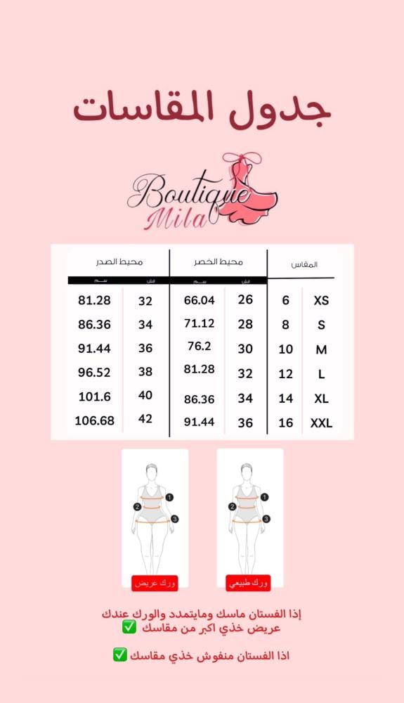 في حال كان الفستان ماسك - ومنطقه الورك عريضه او ممتلئه الرجاء اختيار مقاس اكبر ✅